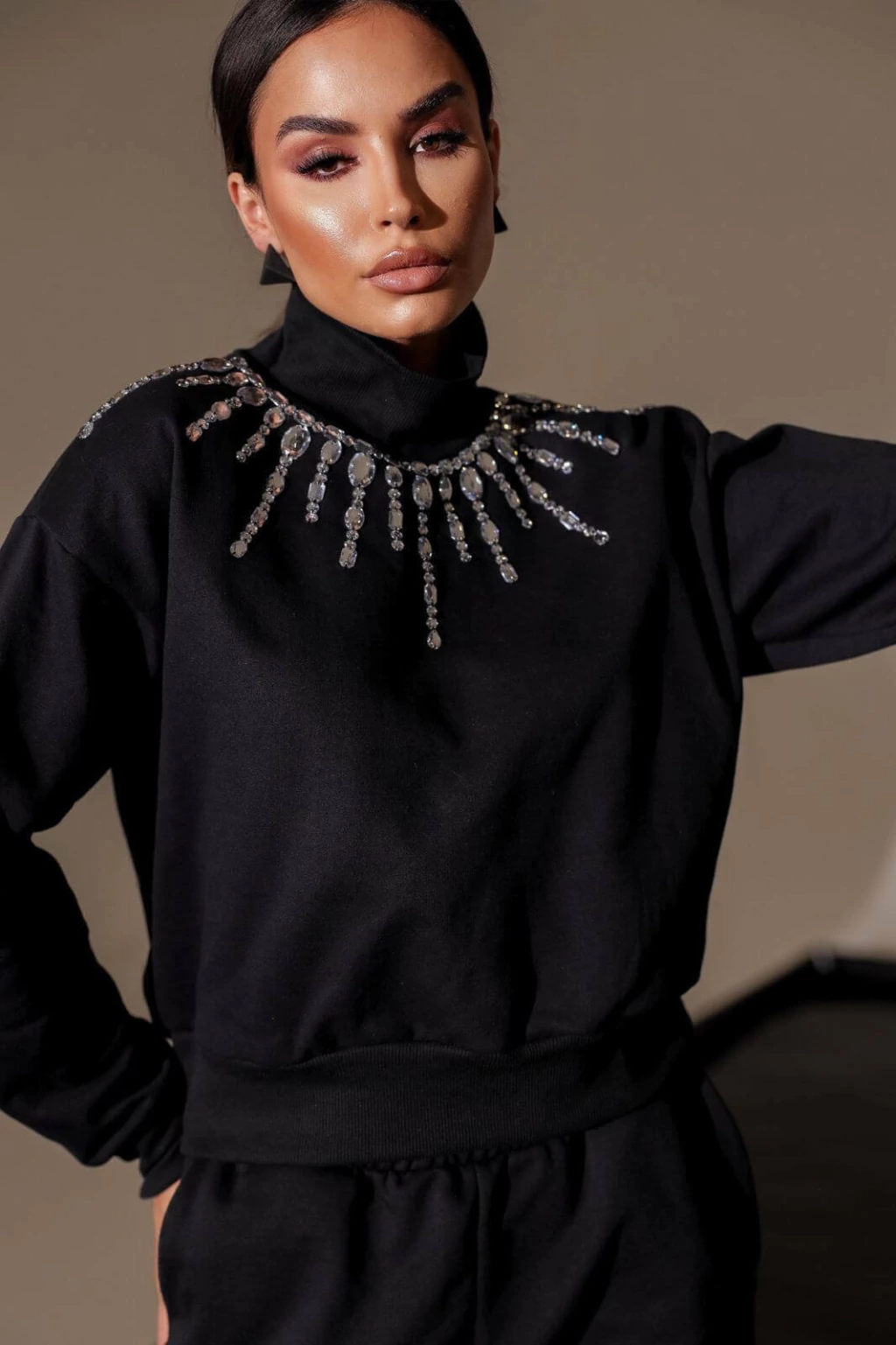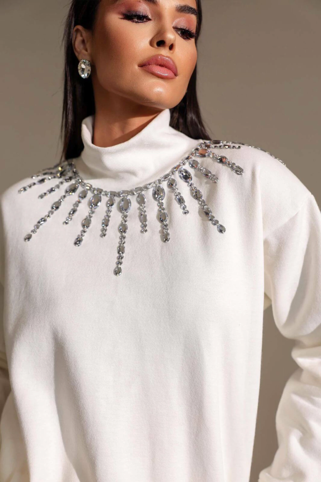 • Aplicações de pedras na blusa: charme e exclusividade.