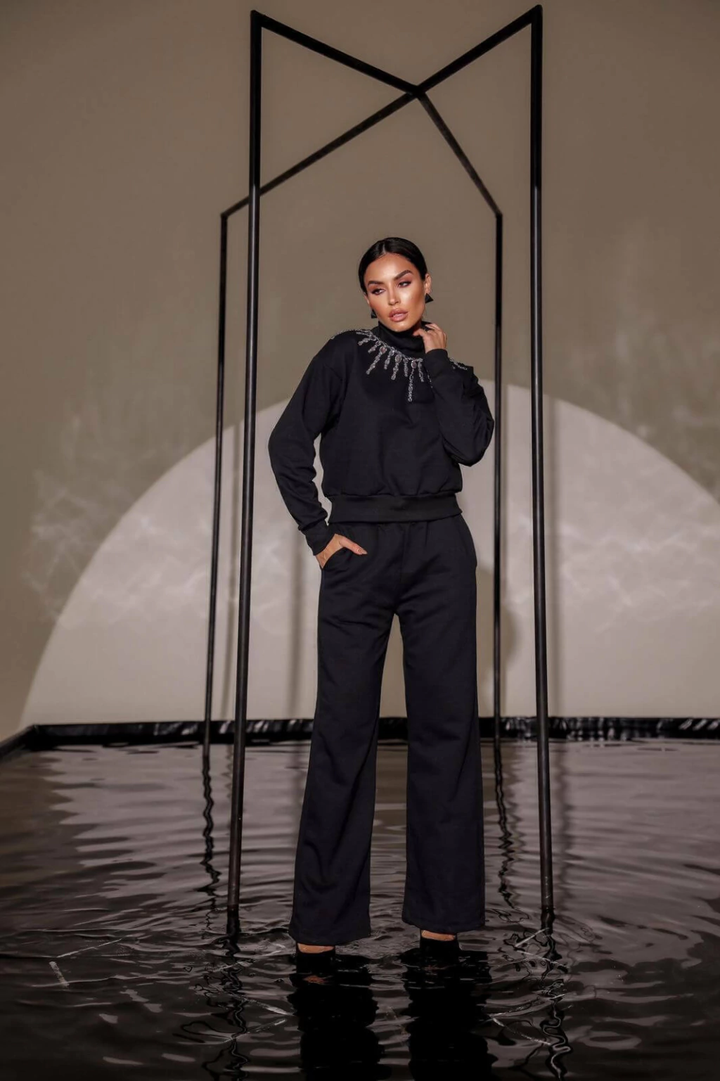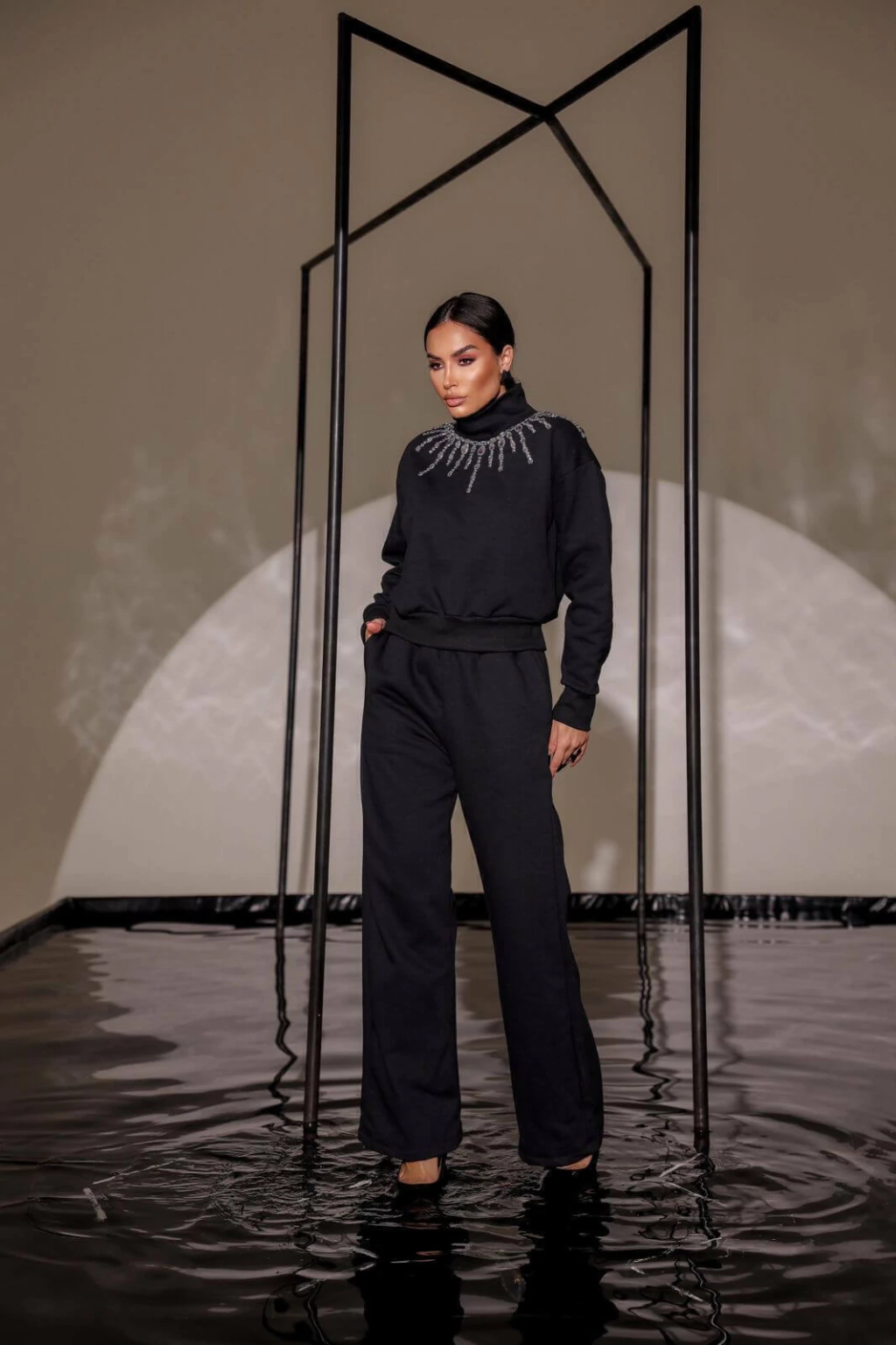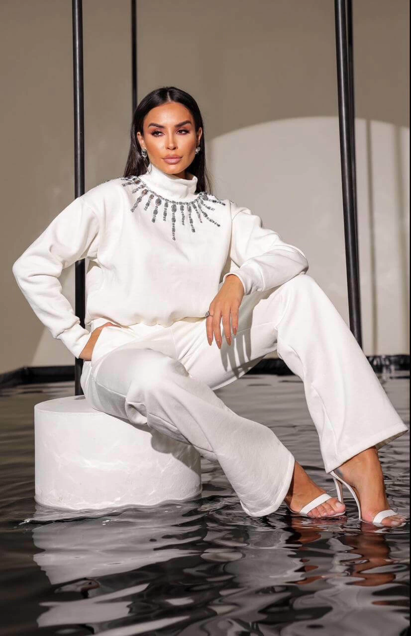 Conjunto em moletom felpado, ideal para os dias mais frios. A blusa de manga longa com meia gola traz aplicações delicadas de pedras, unindo conforto e sofisticação. A calça pantalona, com bolsos faca e cintura com elástico, oferece praticidade e ajuste confortável ao corpo.