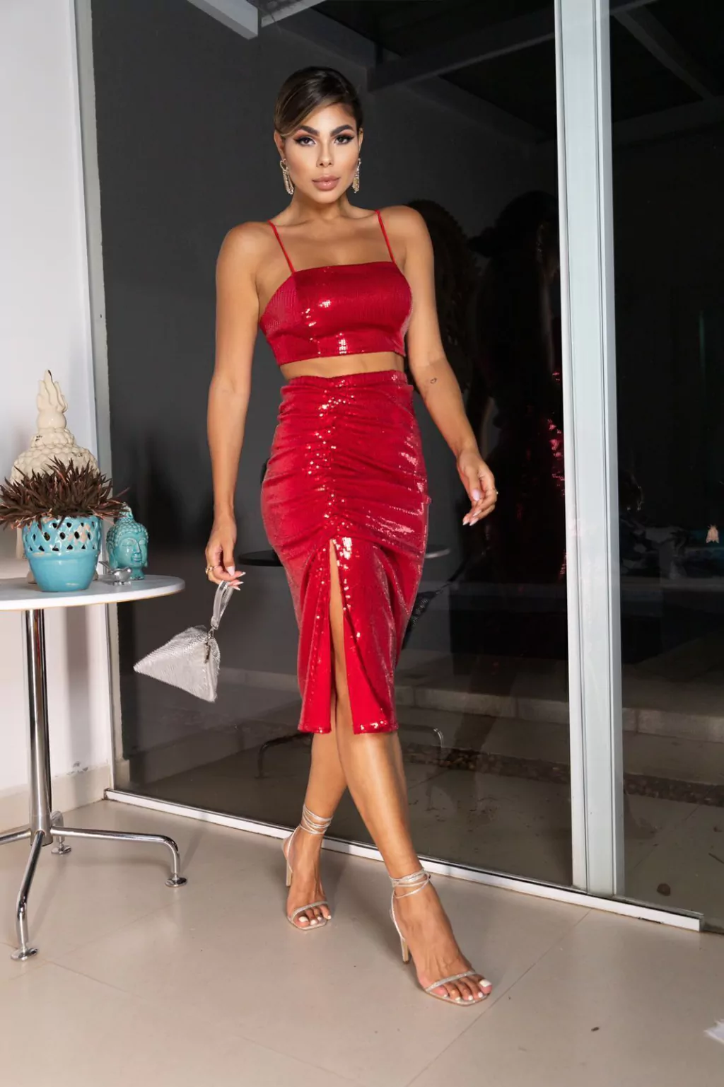 Confeccionado inteiramente em paetê, o Conjunto Helena combina glamour e elegância em duas peças marcantes: top faixa e saia midi. O top, sem bojo, possui alças finas ajustáveis e zíper nas costas, garantindo conforto e caimento impecável. A saia de cintura alta traz fenda frontal e franzido lateral, adicionando movimento, sensualidade e um toque contemporâneo à produção.
