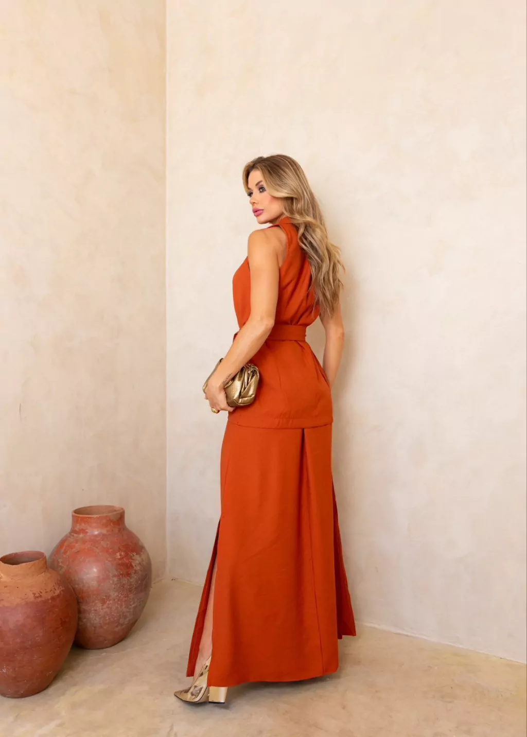 Conjunto composto por colete sem mangas e saia longa em alfaiataria dominique. O colete com decote em V e botões modernos conta com cinto para ajuste que realça a silhueta. A saia de cintura alta tem comprimento longo e fendas laterais, proporcionando movimento fluido e elegância em qualquer ocasião.