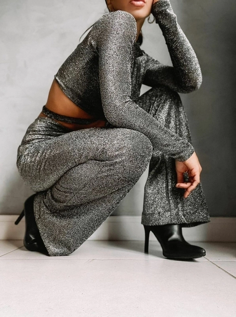 Conjunto Milena é confeccionado em lurex, este conjunto composto por duas peças: um cropped e uma calça flare. O cropped de manga longa possui uma meia gola e é sem bojo, garantindo um caimento confortável e elegante. O detalhe do cordão permite que você ajuste o tamanho conforme sua preferência. A calça flare de cós alto, com elástico na cintura, proporciona um ajuste perfeito e conforto.