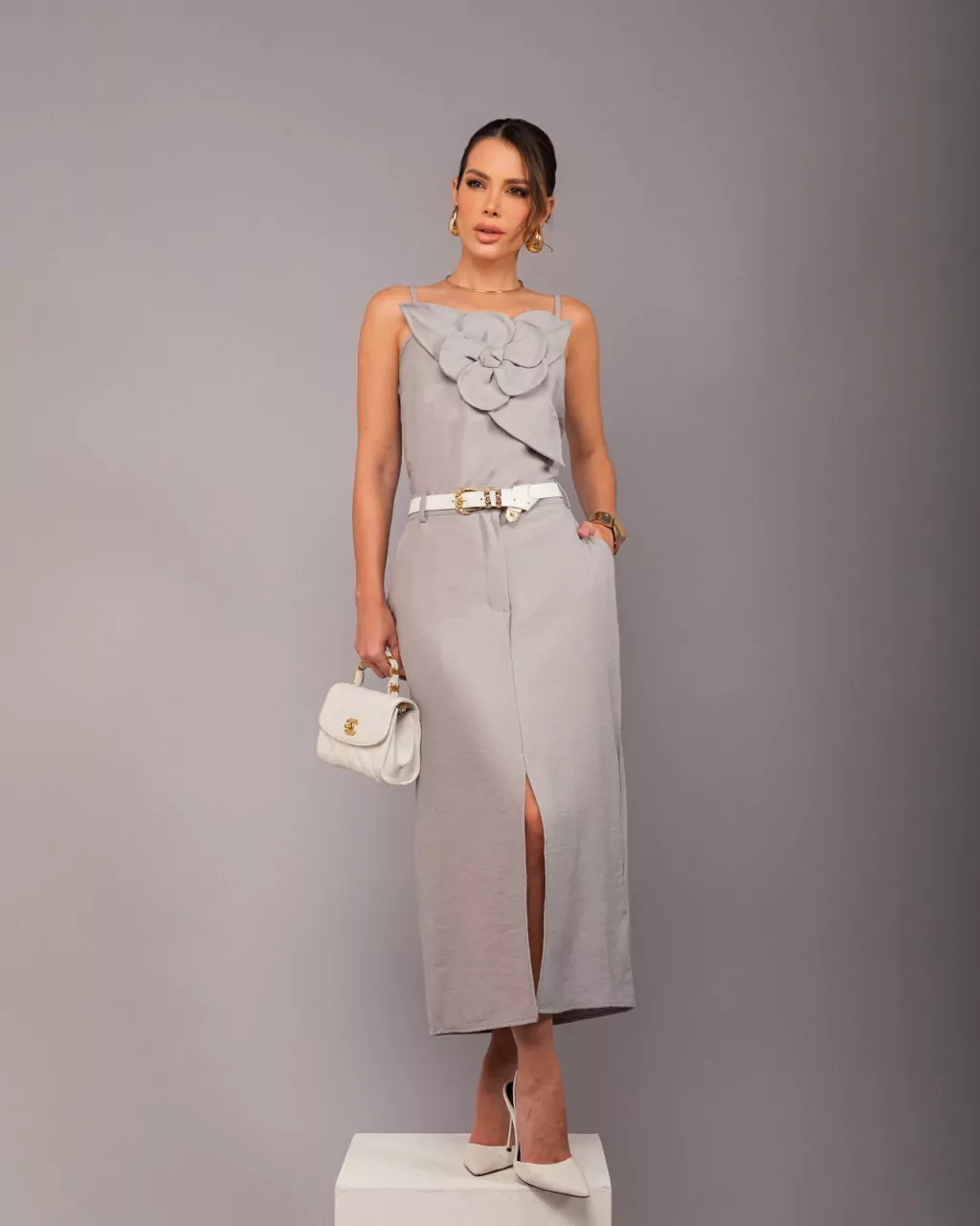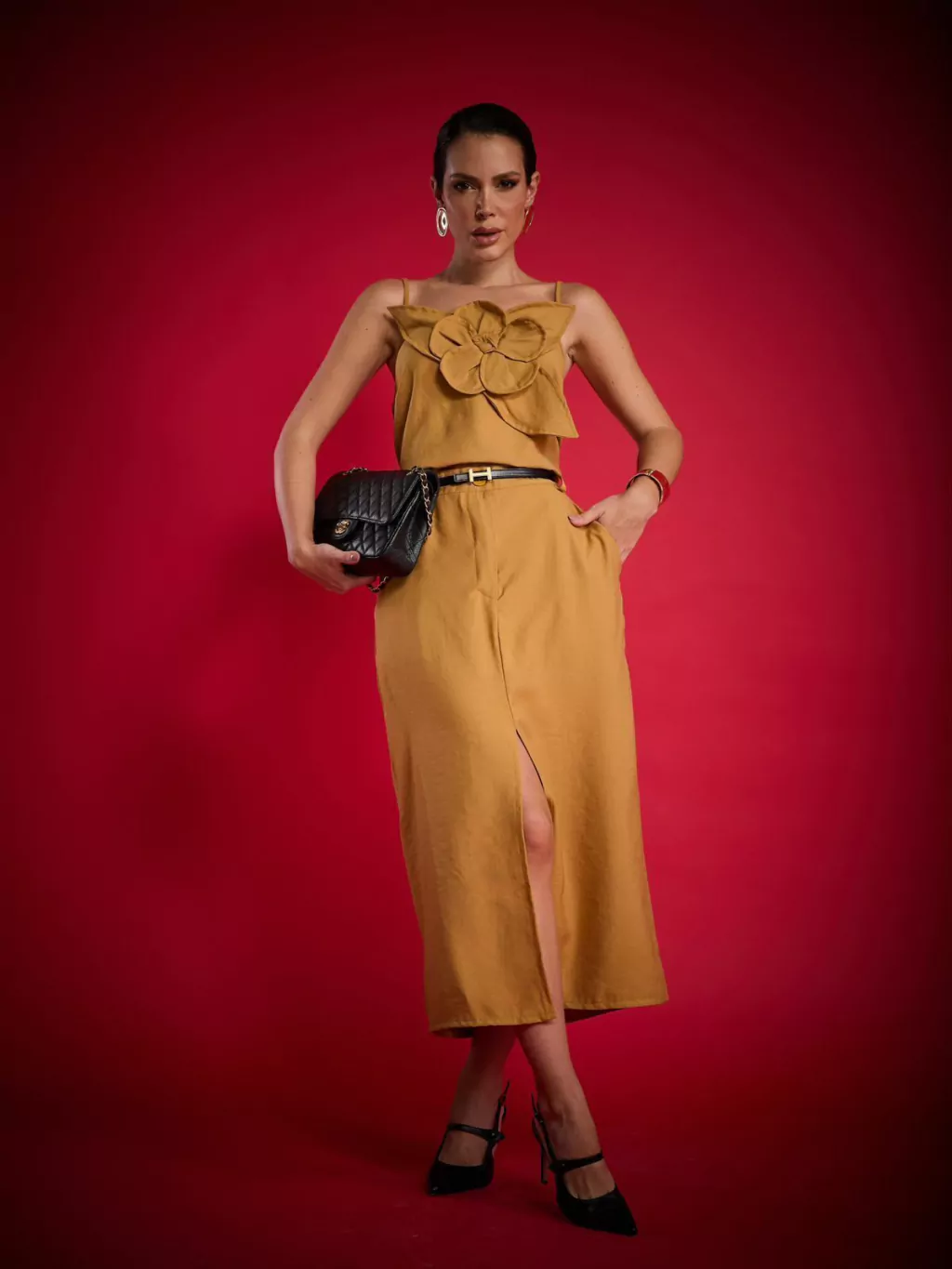 Conjunto elegante em tricoline de alta qualidade, composto por regata com alças finas reguláveis e detalhe floral no busto - toque sutil de sofisticação. A saia midi de cintura alta conta com fenda frontal, zíper posterior invisível e bolsos faca discretos, unindo conforto e funcionalidade com elegância.