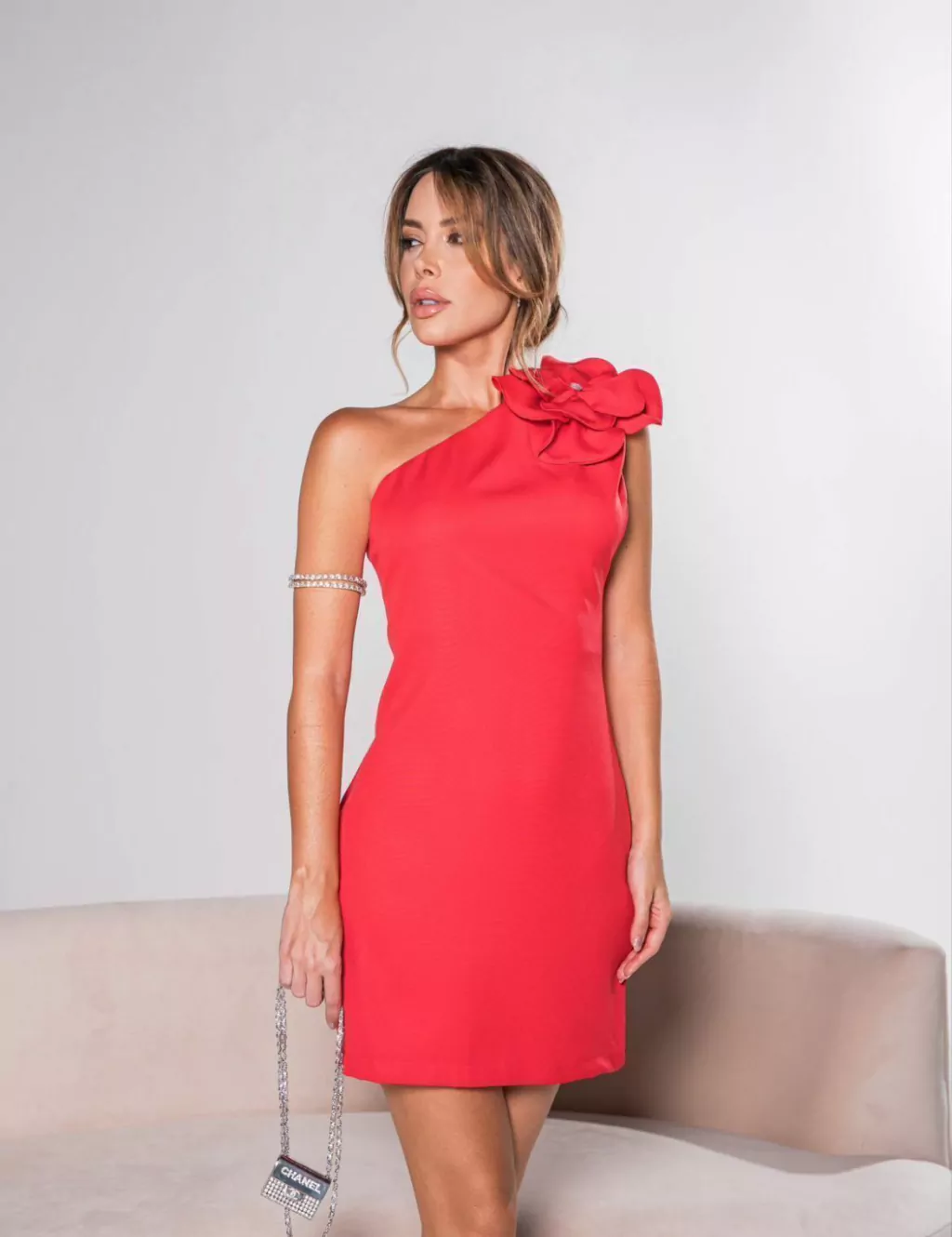 Vestido midi em alfaiataria com modelagem de um ombro só e aplicação de flor delicada no ombro. Possui zíper lateral para vestir com praticidade e caimento impecável. Uma peça versátil e refinada, ideal para eventos formais ou ocasiões mais casuais com elegância.